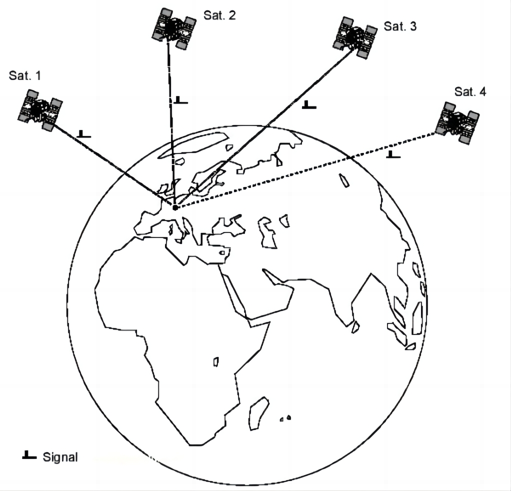 根據幾何理論,通過精確測量地球上的一個站點到三顆衛星之間的距離,就可以依照點到這個三角形的位置來確定。GNSS定位是根據無線電波的傳播速度是恒定的,傳播路徑的線性性質,通過測量空間中的電波的傳播時間來確定距離差的衛星和用戶接收機天線之間的距離差、距離和測量值,再以這些距離差為半徑進行三球交匯,根據聯立方程求解用戶位置。因為衛星時鐘難以與用戶接收時鐘維持嚴格的同步,受衛星時鐘和接收時鐘同步誤差影響,實際距離觀測不是真正的衛星和觀測站之間的距離,而是包含距離誤差,稱此距離為偽距。為了實時解算3點坐標分量和1個差分GNSS接收機時鐘誤差,就需要至少四顆衛星的同步觀測(如圖1)。